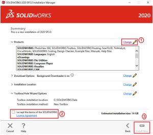 Sau đó tick chọn ô I accept the terms of the SOLIDWORKS (2) và nhấn Install Now (3). Nhấn OK.