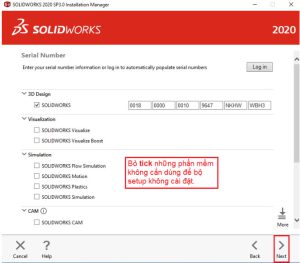 Bỏ tick những phần mềm bạn không dùng đến và SOLIDWORKS bắt buộc phải có rồi nhấn Next.