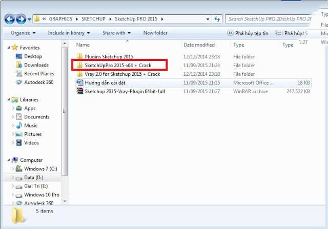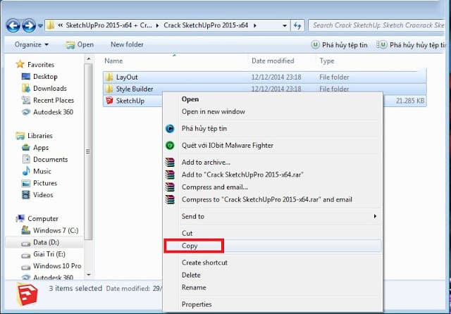 B8: Sau đó thì bạ hãy vào thư mục SketchUpPro 2015-x64 + Crack lúc nãy rồi thì hãy bấm vào thư mục Crack SketchUpPro 2015-x64, sau đó copy hết tất cả các file trong đó
