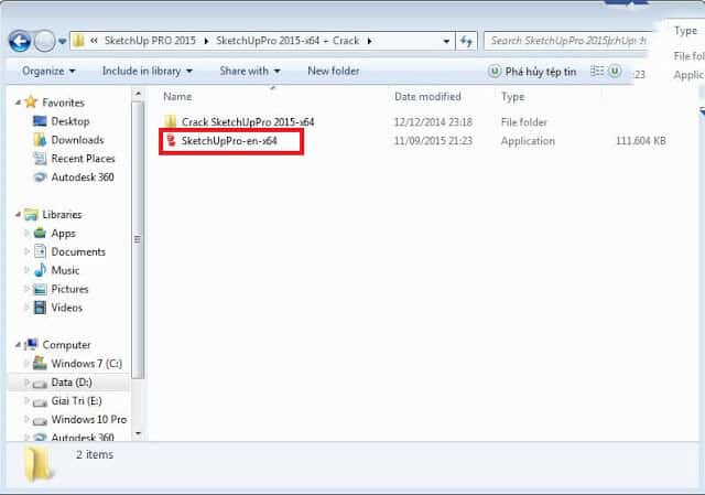 B2: Tiếp theo thì bạn hãy vào thư mục SketchUpPro 2015-x64 + Crack => file SketchUpPro-en-x64.exe: xem hình nhé, quá trình khởi động cài đặt đã được bắt đầu.