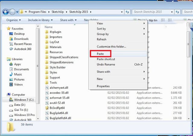 B9: Bạn hãy Paste file vừa copy vào thư mục cài đặt Sketchup 2015 mặc định là C:\Program Files\SketchUp\SketchUp 2015 xem hình kèm theo bên dưới